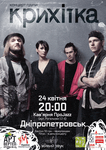 24 апреля в "ProJazz" "Крихітка" обещает представить слушателям песни из дебютного альбома "Рецепт", а также "Крихітка" впервые будут играть в Днепропетровске в обновленном составе - не так давно, после открытых прослушиваний, в которых приняли участие около 40 музыкантов, в группе присоединился новый бас-гитарист Стас Галан.